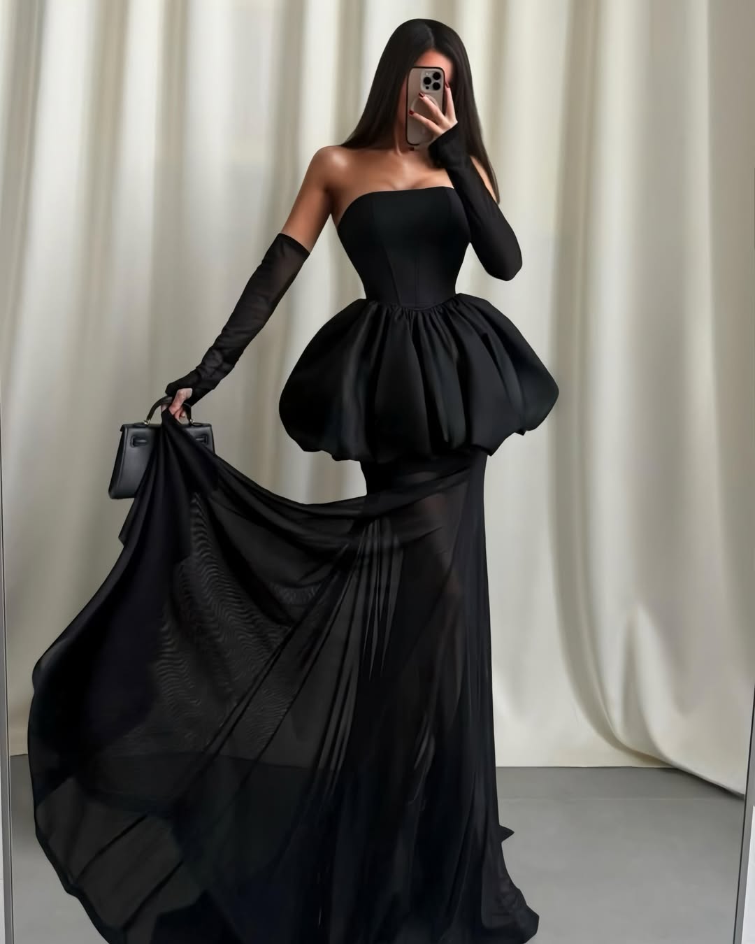 Set elegant compus din rochie din tafta fixă cu structură tip corset și fustă amplă din voal dens, pentru o apariție dramatică și sofisticată. Designul accentuează talia și creează un contrast rafinat între volumul sculptural al rochiei și fluiditatea fustei.