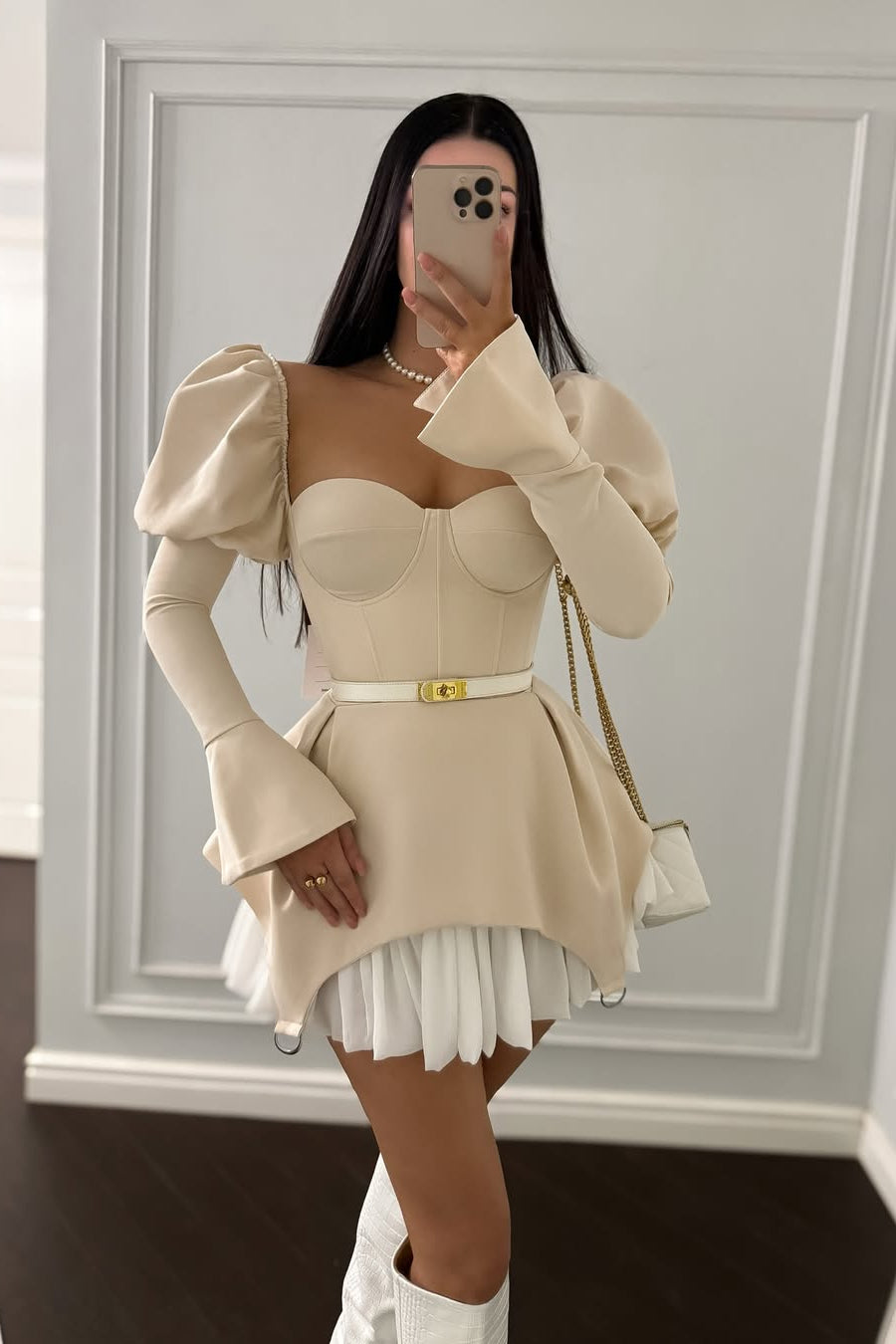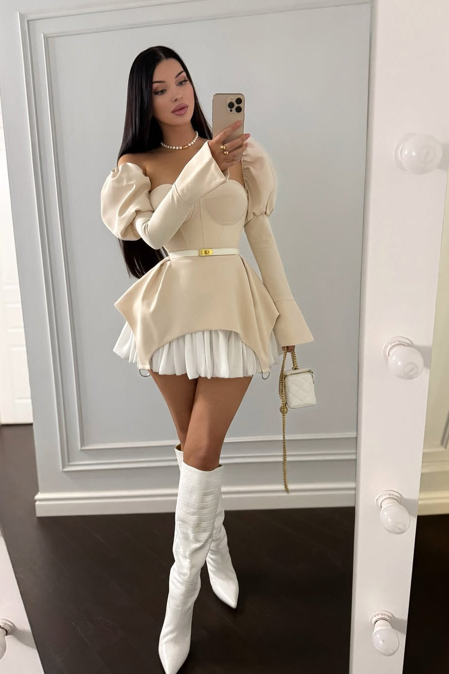 Rochia Nina pune accent pe un design modern, cu influențe elegante, ideal pentru apariții de zi sau seară. Croiala evidențiază silueta printr-un bust structurat și talie bine definită, oferind susținere și un fit confortabil. Decolteul tip inimă este completat de mâneci lungi cu volum la umeri, care echilibrează proporțiile și adaugă un plus de stil. Fusta scurtă, cu strat plisat contrastant, creează un efect vizual dinamic și feminin, potrivit pentru ținute statement.
