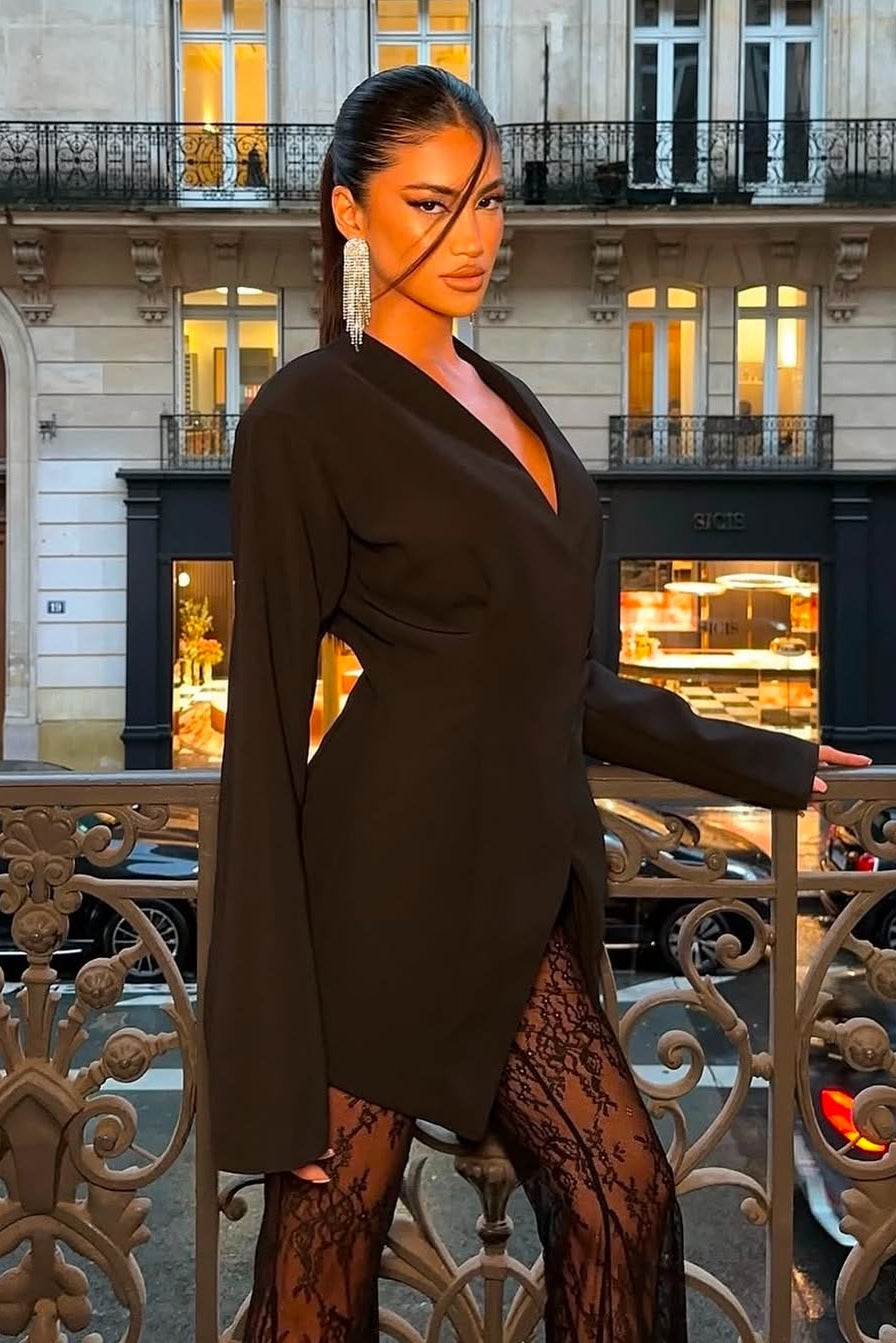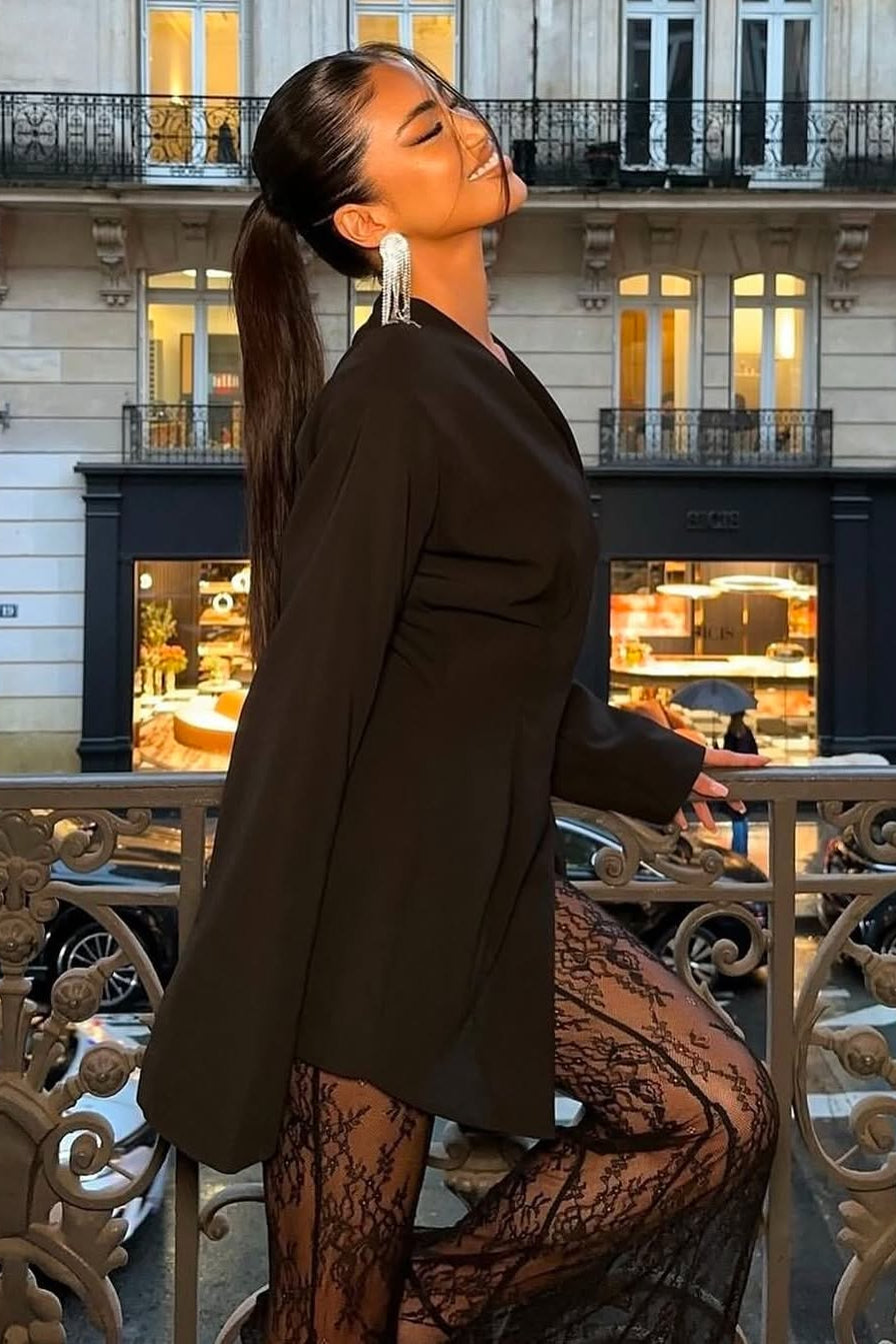 Rochia Nadine îmbină eleganța modernă cu un aer sofisticat, fiind alegerea perfectă pentru apariții rafinate. Designul reunește un sacou cu linii curate și o croială fluidă, completată de pantaloni din dantelă fină, care adaugă un accent feminin și senzual. Versatilă și ușor de accesorizat, această piesă este ideală pentru evenimente speciale sau apariții statement.