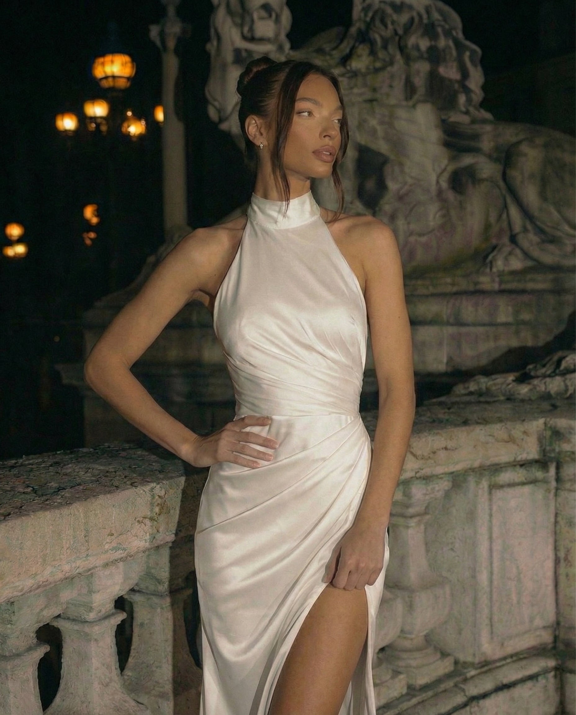 Rochie Sienna este o rochie elegantă, cu un design sofisticat ce evidențiază armonios silueta. Croiala cu bust drapat, guler înalt și talie marcată pune în valoare formele, iar slit-ul lateral adaugă fluiditate și un plus de feminitate.